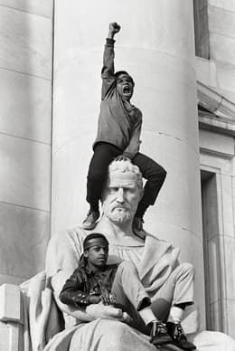 Two children climb a statue during a protest in New Haven amid the 1970 trial of Bobby Seale. Photo by Stephen Shames.